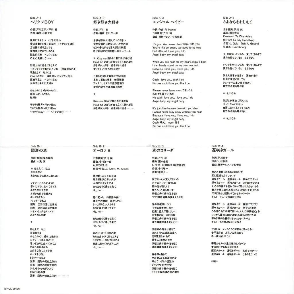 整體感覺是最少女情懷的一張大碟. 如<図形の恋>, <へりクツBoy> 便是青春無敵的開心少女歌. 而戶川京子填上一首半的歌詞. 同時<さよならをおしえて> 是改編Francios Hardy 的名曲.